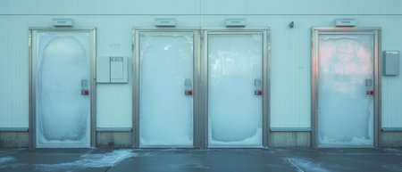 A Cold storage doors in meat processing plant loading bay, illuminated by red lights, create dramatic atmosphere
