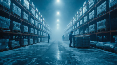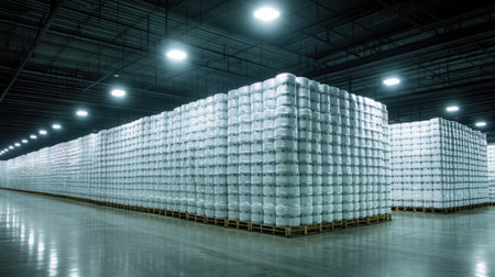 An interior warehouse scene shows stacks of packaged goods, bathed in cool, artificial light. The composition features a symmetrical arrangement, leading the eye into the space. The overall atmosphere suggests a commercial or industrial setting, possibly related to logistics, distribution, or storage applications. It is suitable for various editorial and commercial projects.