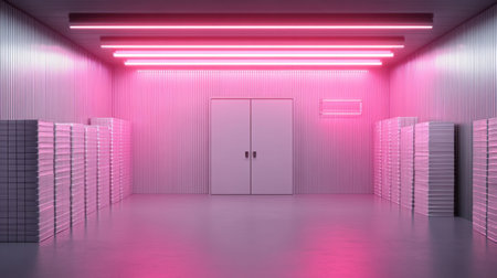 A stylish and modern storage room featuring vibrant neon pink lighting, sleek walls, and minimalist design elements, perfect for creative projects.