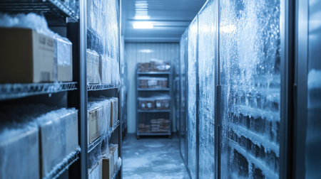 A detailed view of an industrial freezer, showcasing shelves stocked with frozen food products. The icy conditions emphasize food preservation and storage efficiency.