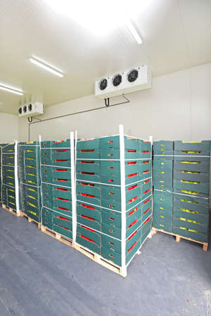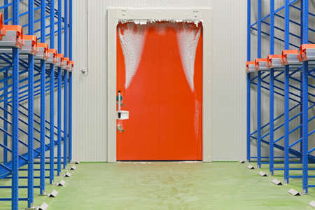 Refrigerators compartment. Warehouse with shelves for food storage. Grocery warehouse with air conditioning. Freezing of products. Stelms with shelves. Refrigeration equipment. Industrial refrigerator.
