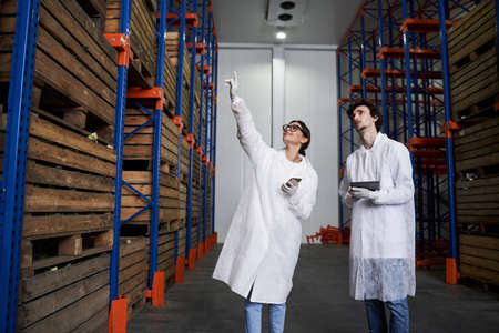 Two technician inspector check machine shelf in cold warehouse. Team professional installation shelf machine in cold storage room.