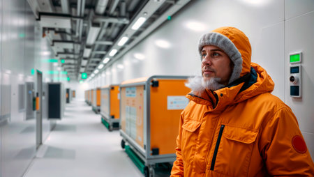 Worker in a thermal parka standing in a frozen industrial facility lined with machinery.
