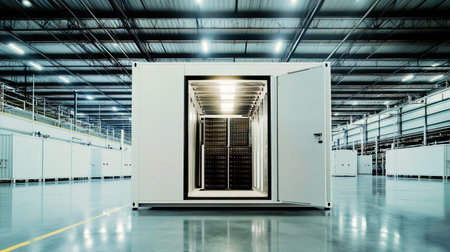 A high-tech data center unit housed inside an open-door white container, located within an expansive industrial warehouse.