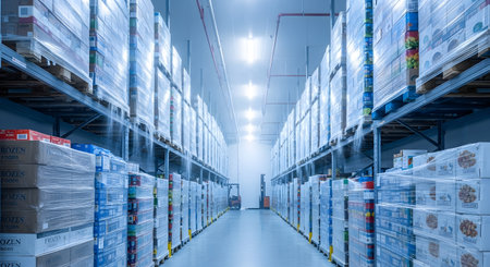 A large, clean warehouse or cold storage facility with high shelves packed with shrink-wrapped pallets of frozen foods. A forklift is visible in the distant aisle under bright industrial lighting, representing logistics and the supply chain.