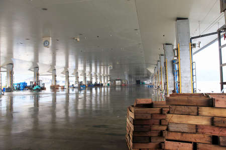 Warehouse cargo building store, warehouse interior with shelves, pallets and boxes for stock and sorting shipment goods in freight, logistics and transportation industrial