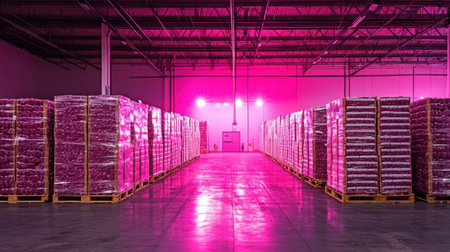 A vivid warehouse interior showcases neatly stacked pallets under striking pink lighting. This modern industrial space captures organized storage and efficient logistics in a serene setting.