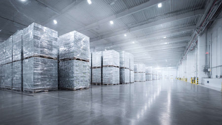 A spacious warehouse with high ceilings, featuring rows of wrapped pallets and stacked boxes, showcasing an organized storage space with industrial lighting and polished floors.