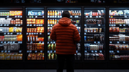 A man in a red jacket is looking at the food and drink section of a store. The store is well stocked with a variety of items, including a large selection of drinks. The man is browsing the shelves