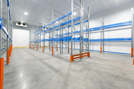 Interior of empty warehouse with empty racks