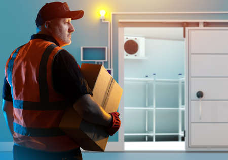 Freezer storage. Freezing of products. Storage racks. Air conditioners cooled the food warehouse. Storage of goods. A man in work clothes next to a cold warehouse. Storekeeper with a cardboard box.