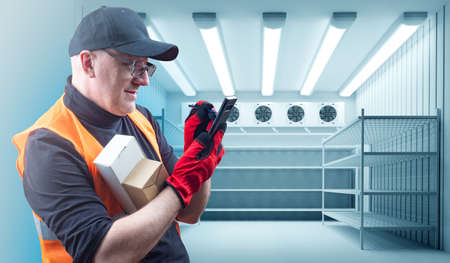 Warehouse worker in refrigerator. Human with small boxes and phone. Man in industrial refrigerators. Worker in empty production refrigerator. Guy is in cold storage warehouse. Warehouse manager