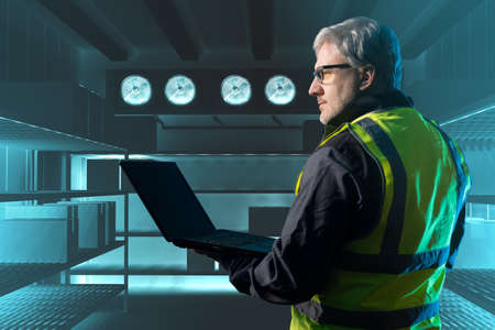 Staff worker standing control inside Cold buiding. Engineering service, Technician service.