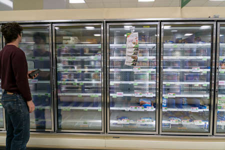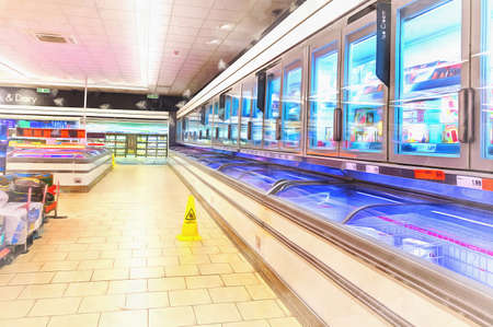 Frozen goods area in a supermarket, long refrigerated display cases with goods