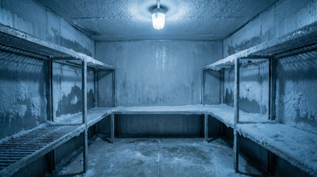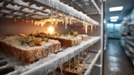 This image captures frozen bread on shelves adorned with frost in a modern cold storage facility, showcasing food preservation techniques and freshness.