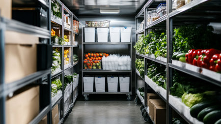 Organized industrial walk-in cooler with fresh vegetables and produce storage.