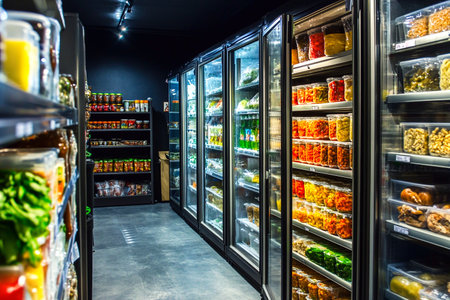 A well-organized refrigerated aisle in a modern grocery store, featuring neatly stocked shelves with a variety of food products. The clean and efficient layout is ideal for themes related to retail, shopping, and food choices.