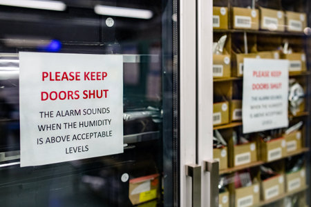 Close up of a sign on a moisture sensitive cabinet in a electronics manufacturer warning people to keep doors closed to protect the raw components inside