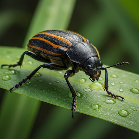 An exquisite close-up of a colorful beetle perched on a leaf, adorned with droplets of water, emphasizing nature's beauty and intricate details in a tranquil setting.