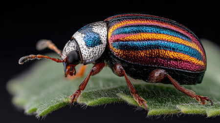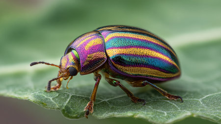 A vibrant beetle perched gracefully on a lush green leaf, showcasing intricate patterns and colors. This close-up captures the essence of nature's beauty and diversity.
