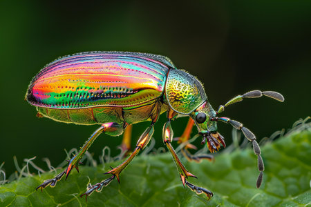 Captivating close-up of a colorful beetle displaying iridescent wings perched on vibrant green leaves, showcasing the beauty of nature's diversity and intricate details.