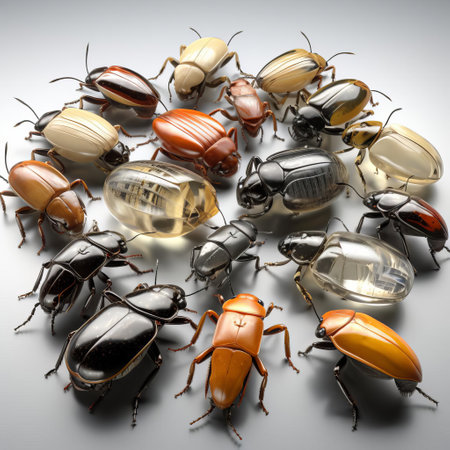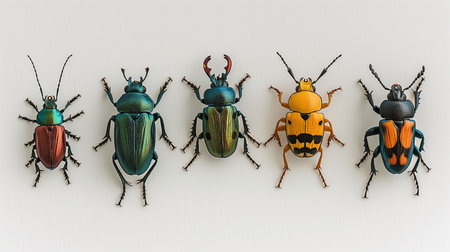 A vibrant arrangement of various beetle species showcasing unique colors and patterns. Ideal for educational and creative projects related to nature and biodiversity.