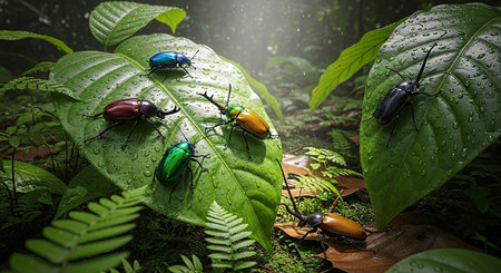 Colorful beetles crawling on branch in rainforest habitat