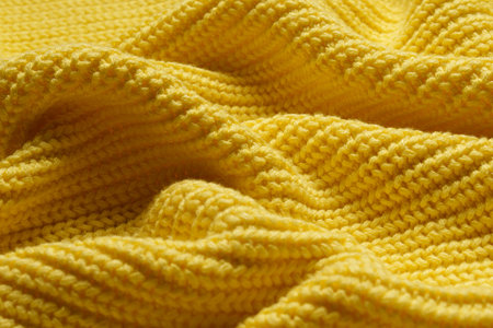 Knitted clothes. Waves of yellow fabric with a knitting pattern. Textiles. Banner for advertising goods for creativity.
