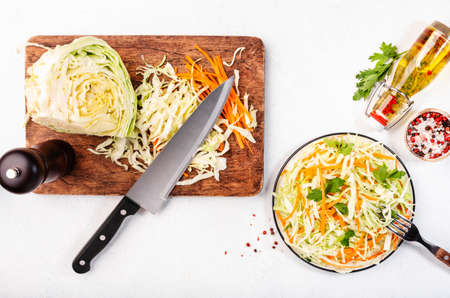 White cabbage salad coleslaw with carrot on white kitchen table background. Top view, copy space