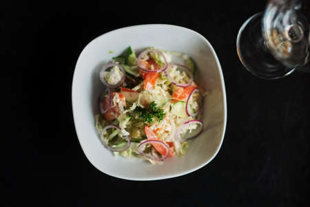 Salad with tomato, cabbage and onions seasoned with spices and olive oil in focus on the table