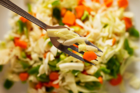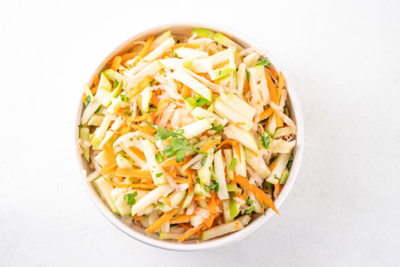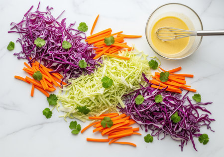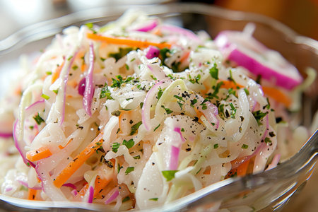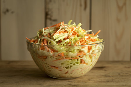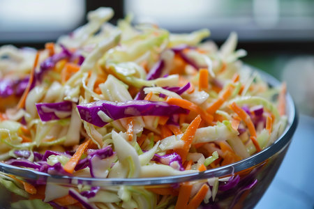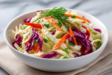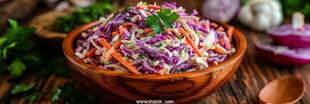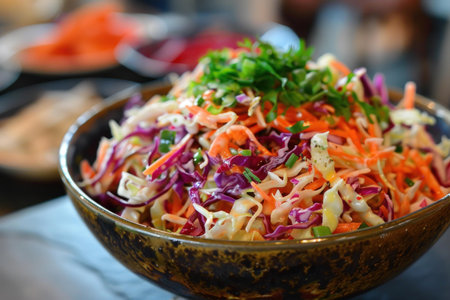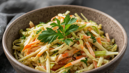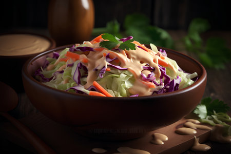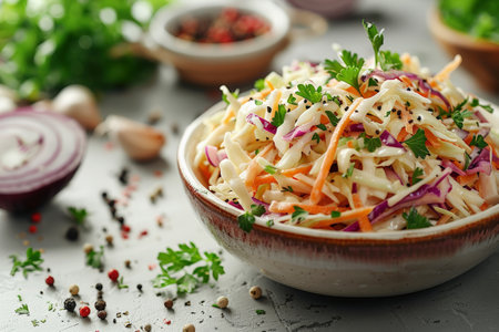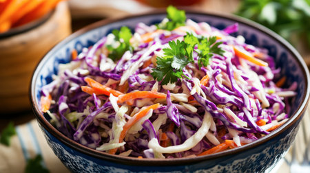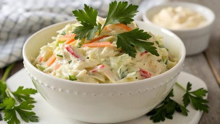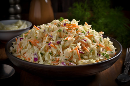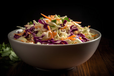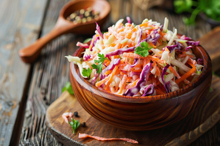Freshly prepared coleslaw with vibrant cabbage, carrots and parsley, ideal for food blogs and recipe sites. With Generative AI technology.