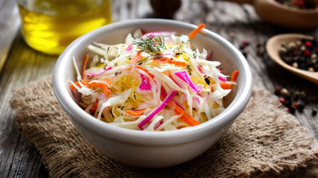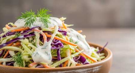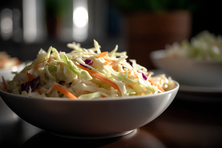 Fresh coleslaw salad in a ceramic bowl, perfect for healthy eating and recipe websites. With Generative AI technology.