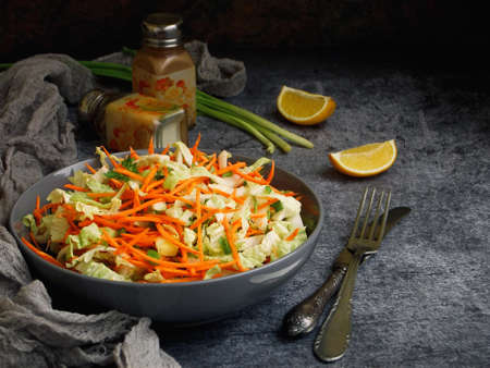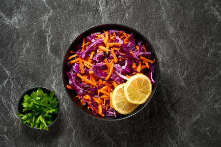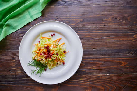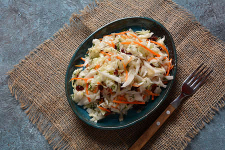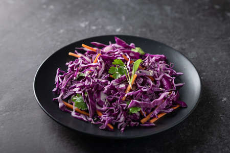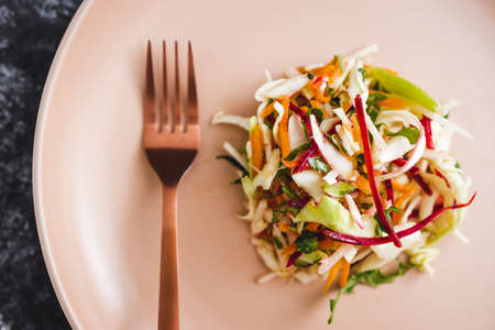 vegetables salad with cabbage, carrot, parsley on grey clay plate on dark background. Cole Slaw Salad.