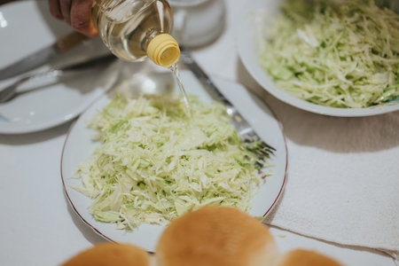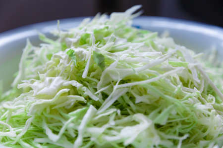 Colorful Shredded Cabbage Salad With Carrots and Herbs Prepared in the Kitchen