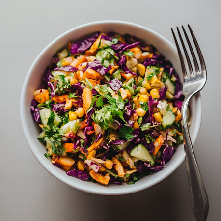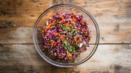 A vibrant and colorful fresh vegetable salad featuring purple cabbage, carrots, and greens. Perfect for healthy meals and culinary displays.