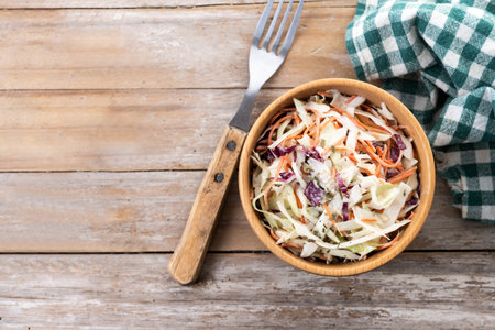 Fresh Coleslaw Salad served in bowl on wooden table, top view, copy space