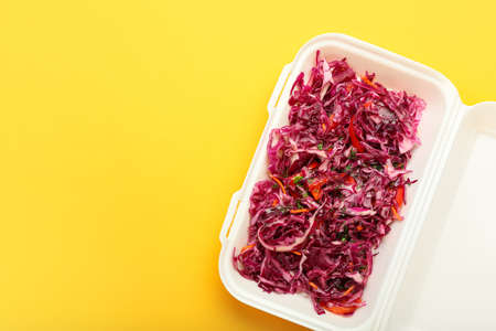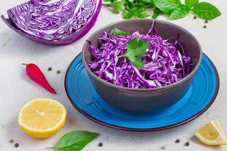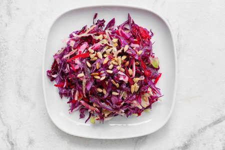 Red cabbage coleslaw with carrot on a light background. Healthy food concept.