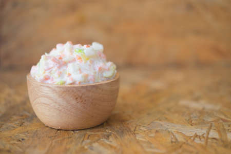 Fresh vegetable salad with carrot, onion and mayonnaise closeup