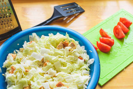 Peking cabbage leaves, chicken and chopped tomato on a wooden table. Cooking Caesar Salad.