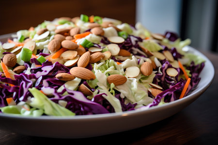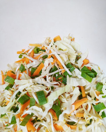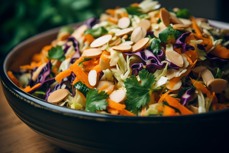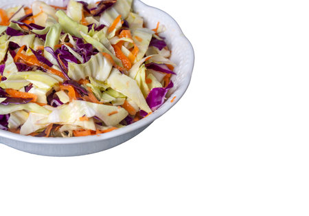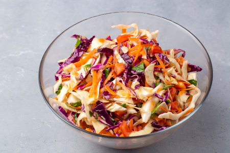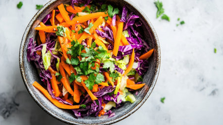 A vibrant bowl of fresh cabbage and vegetable salad, featuring colorful carrots and greens. Perfect for healthy meals, garnishing, or colorful presentations.