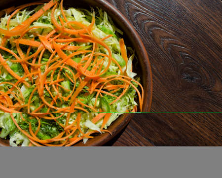 Salad with coleslaw and carrots in a bowl on a wooden table