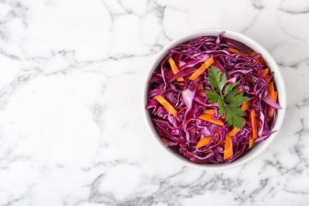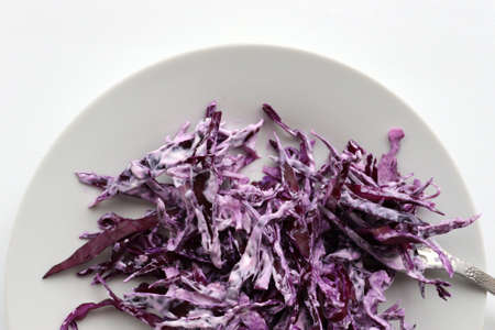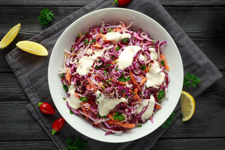 Easy homecooked creamy coleslaw from red cabbage in a bowl on white table background. Top view, copy space. Fresh vegetable salad with mayonnaise dressing. Flat lay food. Healthy eating concept