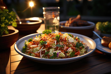 Cabbage salad with sesame sauce on a wooden plate on a balcony., generative AI