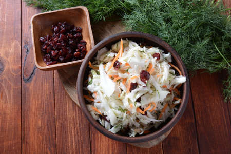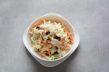 Cabbage salad with carrot, smoked almonds and dried cranberries. Coleslaw Salad. Fermented cabbage- Russian cuisine.Healthy vegan food concept.