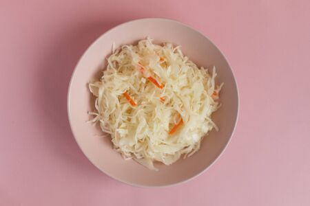 Pickled cabbage in a bowl on pastel pink colored background top view. Fermented vegetables.
