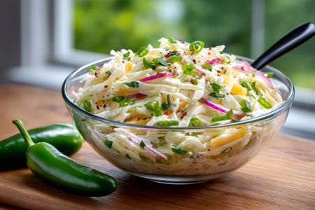 Creamy coleslaw salad served with fresh jalapeno peppers and dill on a wooden board