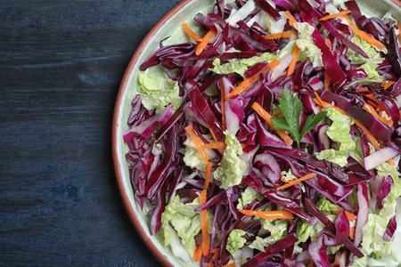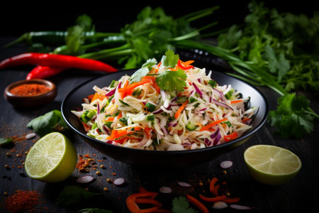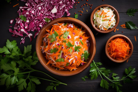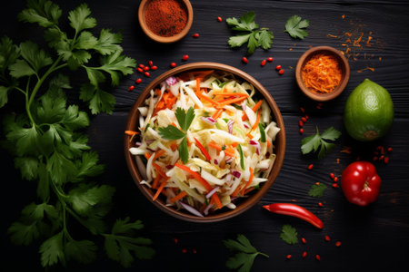 Top view of vibrant coleslaw with fresh vegetables and spices on a dark table for healthy eating