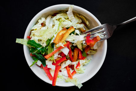 Fresh and colorful salad with healthy ingredients. Nutritious vegetarian meal on wooden background. Vegan diet food concept with salad.