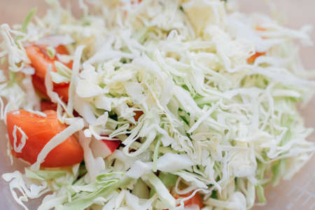 Chopped vegetables - cabbage, carrots, corn. Vegetable salad close-up.