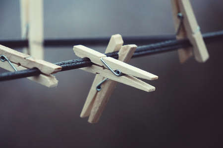 Old clothespins hang on the wire outdoor, blurred background, selective focus.